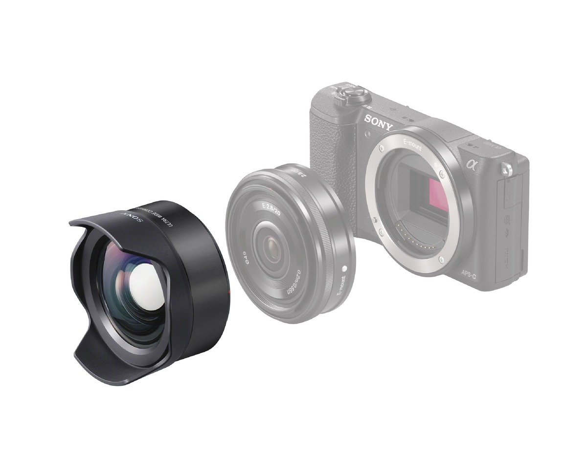 The VCL-ECU2 adapter is compatible with the SEL16F28 16mm F2.8 and SEL20F28 20mm F2.8 wide angle (APS-C) lenses, boosting ultra-wide angle performance to 12mm (with SEL16F28) or 16 mm (SEL20F28). The VCL-ECF2 Fisheye Converter creates exaggerated perspective effect, with a full 180 degree field of view for the SEL16F28, and 133 degrees for the SEL20F28. Each converter sports a smart new black finish.