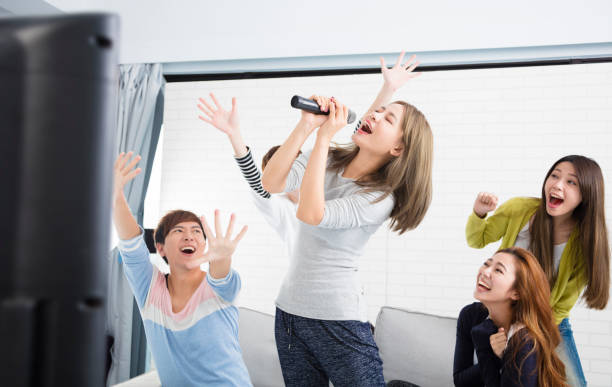 young woman holding microphone and singing at karaoke