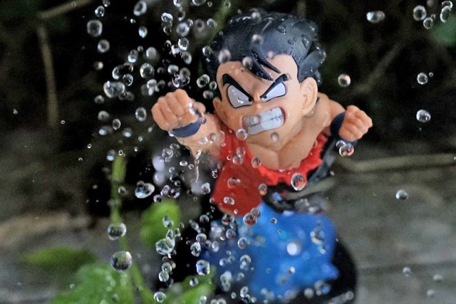 Caption: “Son Goku has no clue at all how to fight this opponent. He sees water bubbles all round and seems to zoom in to him. He must take fast action . With his right fist stretched outwards, Goku topedoed to smash through the bubble envelop. Can he do it ?”